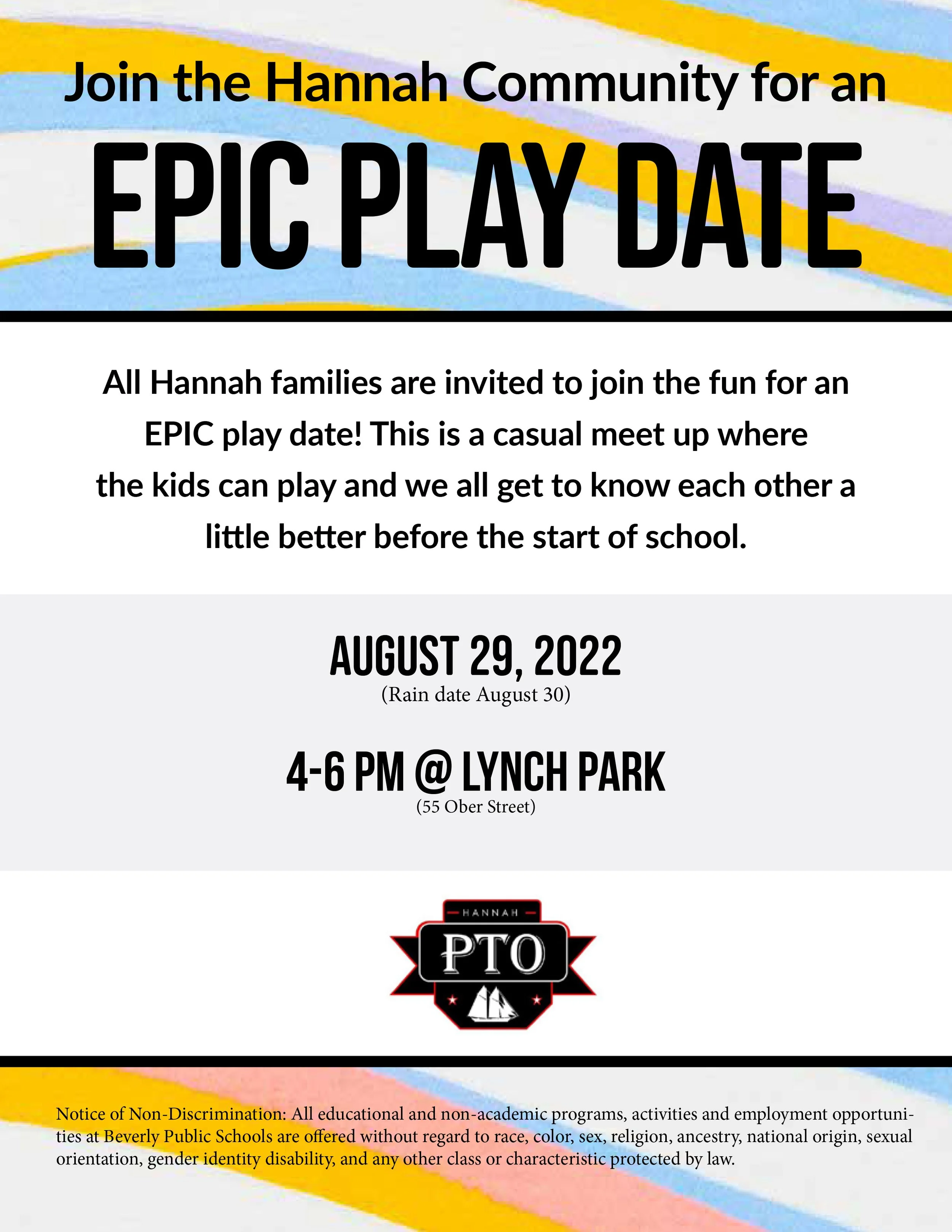 Calling all Hannah families - Join us for an Epic Play Date at Lynch Park before school starts! Rain date 8/30.